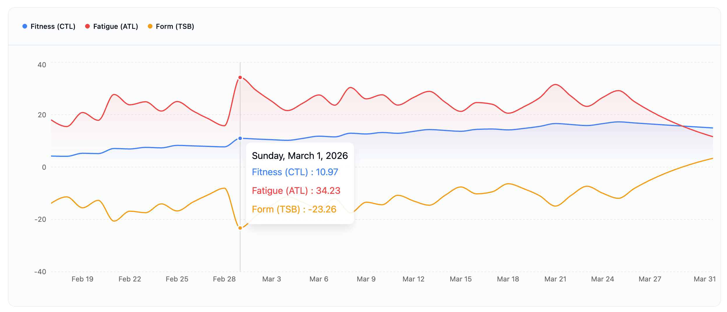 - What it means: If your Fitness is high but your Fatigue is low, you are “Fresh” and ready to perform your best.